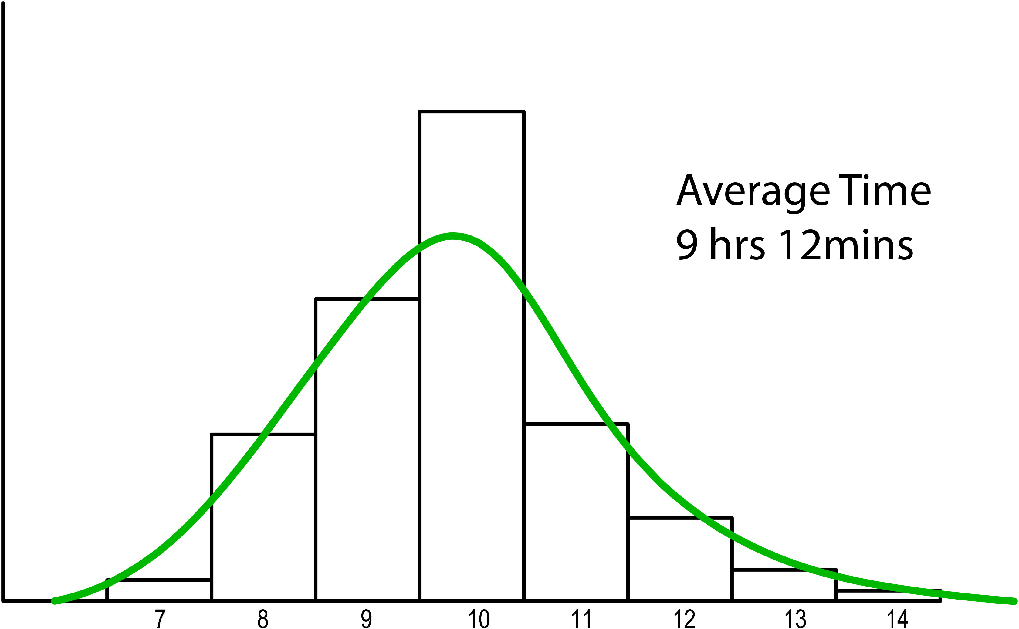 We did indeed manage to generate a Bell Curve, with most people finishing in the 9-10 hour time (so arrived 6am till 7am).